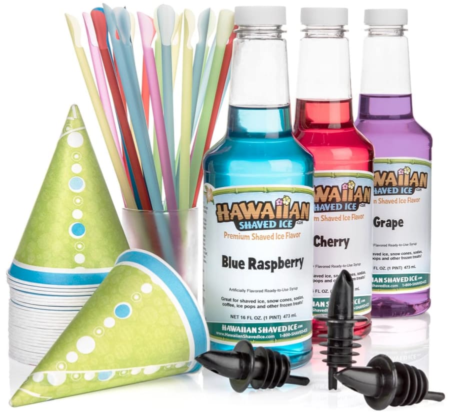 INCLUDES: Three 16-ounce pints of shaved ice and snow cone syrup – Cherry, Grape, Blue Raspberry, three bottle pourers, 25 spoon straws, & 25 snowcone cups